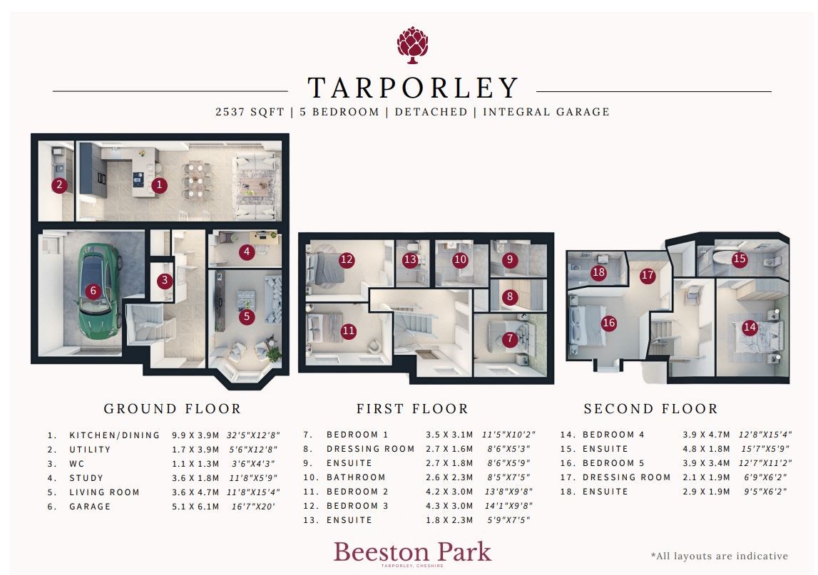 The Tarporley is an elegant five-bedroom home set across three storeys, with a red brick exterior and integral garage. Inside, you'll find a flexible and generously proportioned layout that effortlessly supports busy family life, home working, and relaxed entertaining. Its striking exterior opens into a flexible layout with generous proportions throughout, featuring an open-plan kitchen, dining and family area with sliding doors to the garden, plus a separate lounge, study, and utility room.
