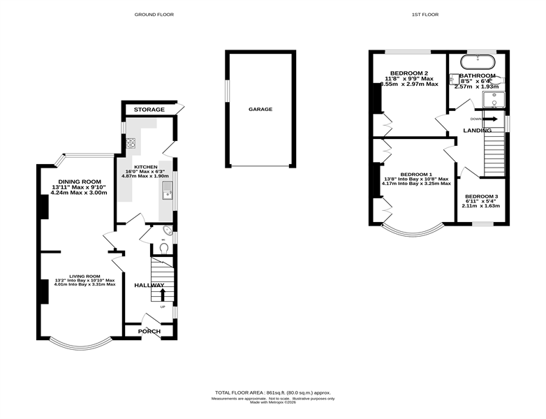 The ground floor features an entrance porch and hallway, a downstairs WC, and a bay-fronted living room leading to a dining room with lovely views of the rear garden. The contemporary, refitted kitchen completes the ground floor.