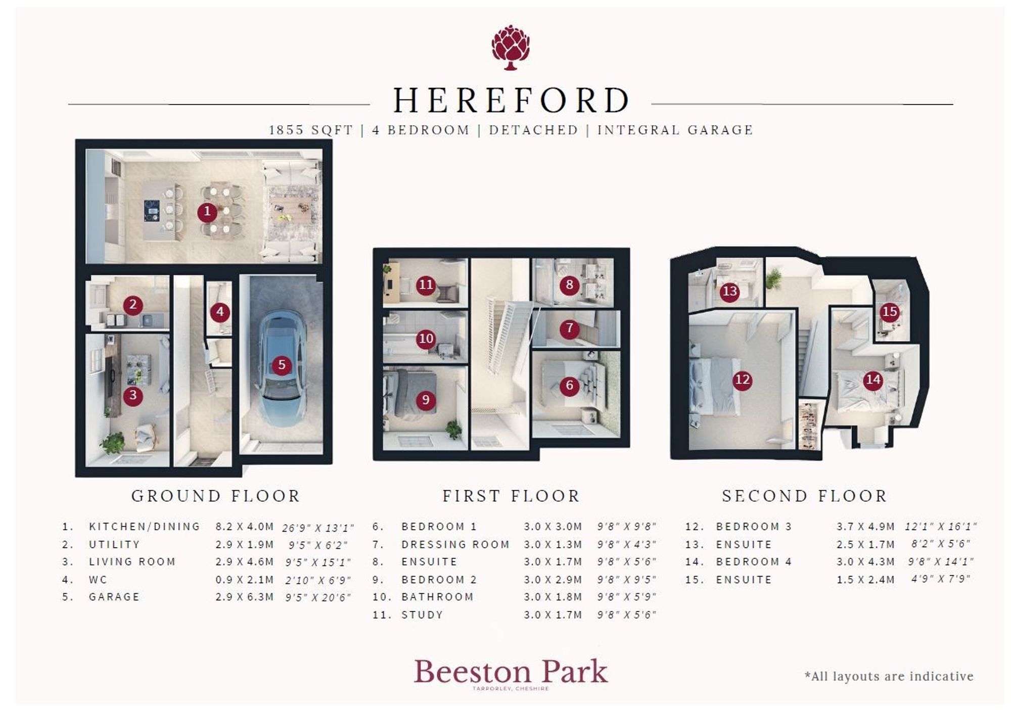The Hereford is a beautiful four-bedroom home, with a striking red brick exterior and integral garage. Set across three storeys, three of four bedrooms benefit from an en-suite, with dressing area to the master bedroom. The Hereford also features a luxury family bathroom and private study in addition to lounge, study, and utility room, alongside an open-plan kitchen, dining and family area with sliding doors leading to the rear garden.